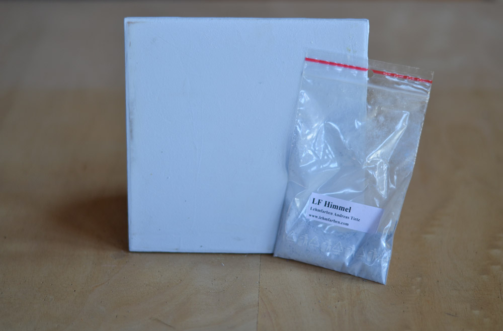 Sie erhalten unsere Lehmfarbe "Himmel" für samtrauhe Oberflächen in Pulverform.