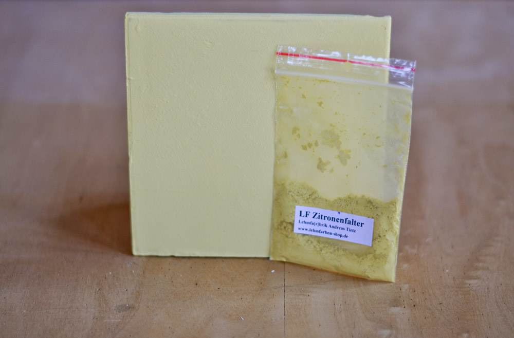 Sie erhalten unsere Lehmfarbe "Zitronenfalter" für feine Oberflächen in Pulverform.